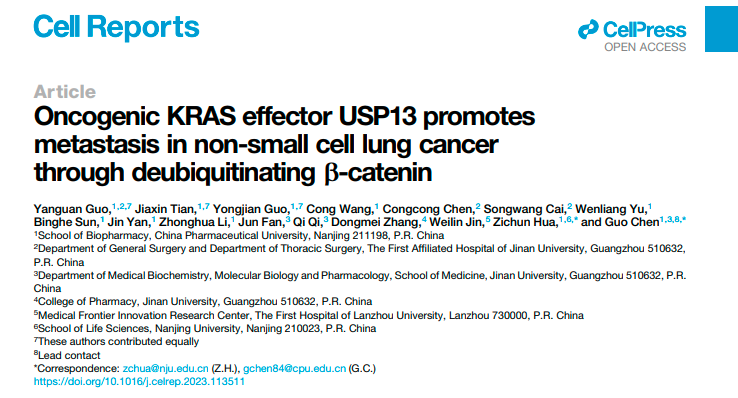 我院陈果教授课题组在Cell Reports期刊上发表了题为Oncogenic KRAS effector USP13 promotes metastasis in non-small cell lung cancer through deubiquitinating β-Catenin的文章。该研究发现KRAS激活上调去泛素化酶USP13,是KRAS突变肿瘤的一个新的下游效应蛋白。USP13促进肺癌细胞转移,其高表达与肺癌患者不良预后高度相关。