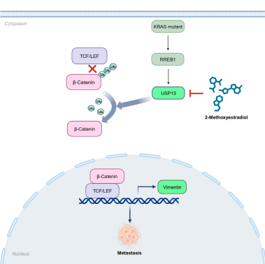 该研究鉴定USP13是治疗转移性KRAS突变肿瘤的潜在药物靶点。并且,筛选发现了一个天然小分子药物2-Methoxyestradiol能够直接抑制USP13活性,为通过靶向USP13治疗KRAS突变肿瘤的转移提供了一个先导化合物,具有临床转化潜力。将为KRAS突变肿瘤的精准治疗提供了一个新的科学依据。日本无码AV 博士生田家欣为该论文的共同第一作者。