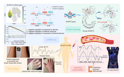 核苷酸寡聚化结构域样受体蛋白12相关自身炎症性疾病(NLRP12-AID)是一种超罕见的常染色体显性遗传疾病,目前全球报道不足百例。因其超罕见性,该疾病发生机制及治疗策略尚不明确。本研究在系统总结全球89例NLRP12-AID基因突变规律与临床信息的基础上,采用全外显子测序等手段发现了1例全新的致病突变位点NLRP12(A218V)。该杂合突变可导致反复发热、关节痛和皮肤过敏等自身炎症性疾病典型症状。